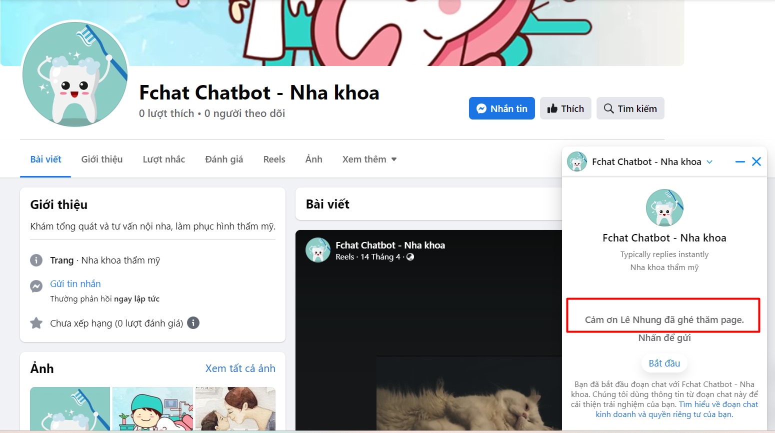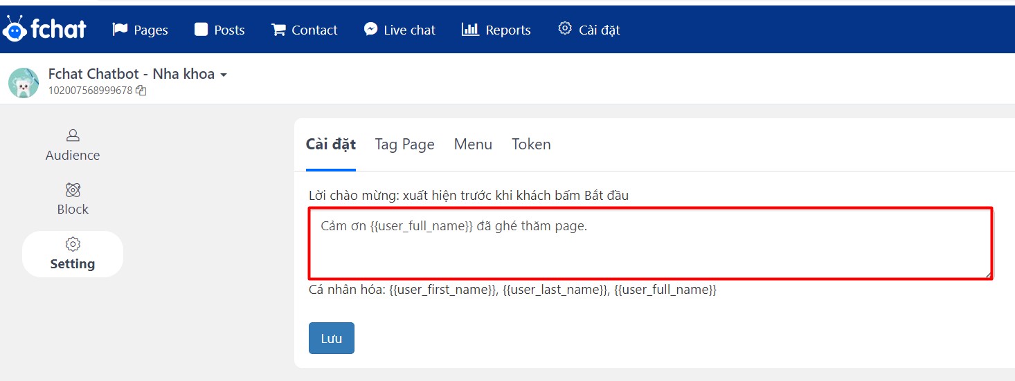 Bạn vào Cài đặt page thiết lập nội dung vào phần lời chào.