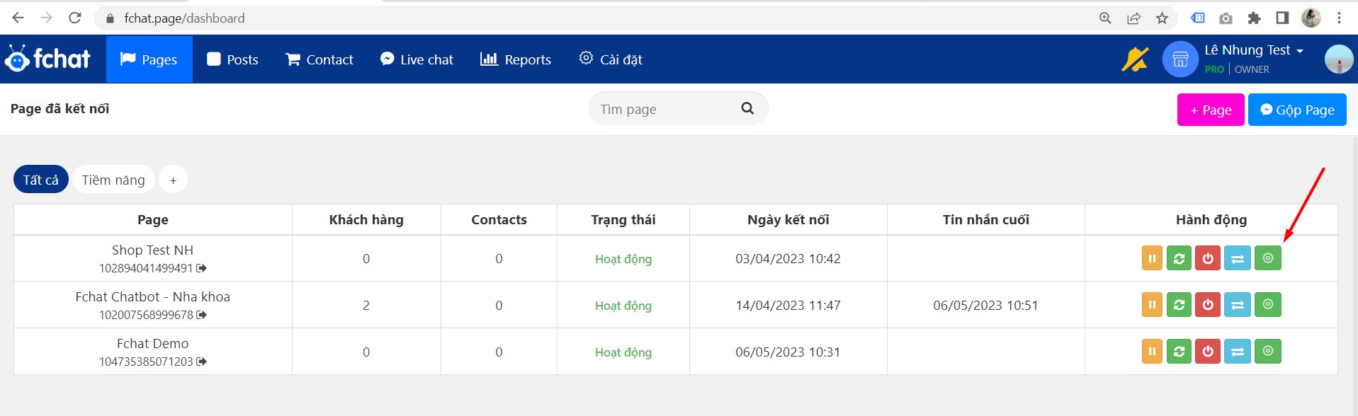 Bạn bấm Cài đặt page tại hành động page.