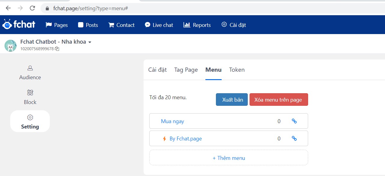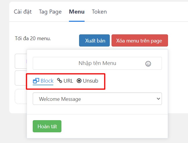 Sau khi thiết lập xong bạn bấm Xuất bản để cập nhật menu lên fanpage.