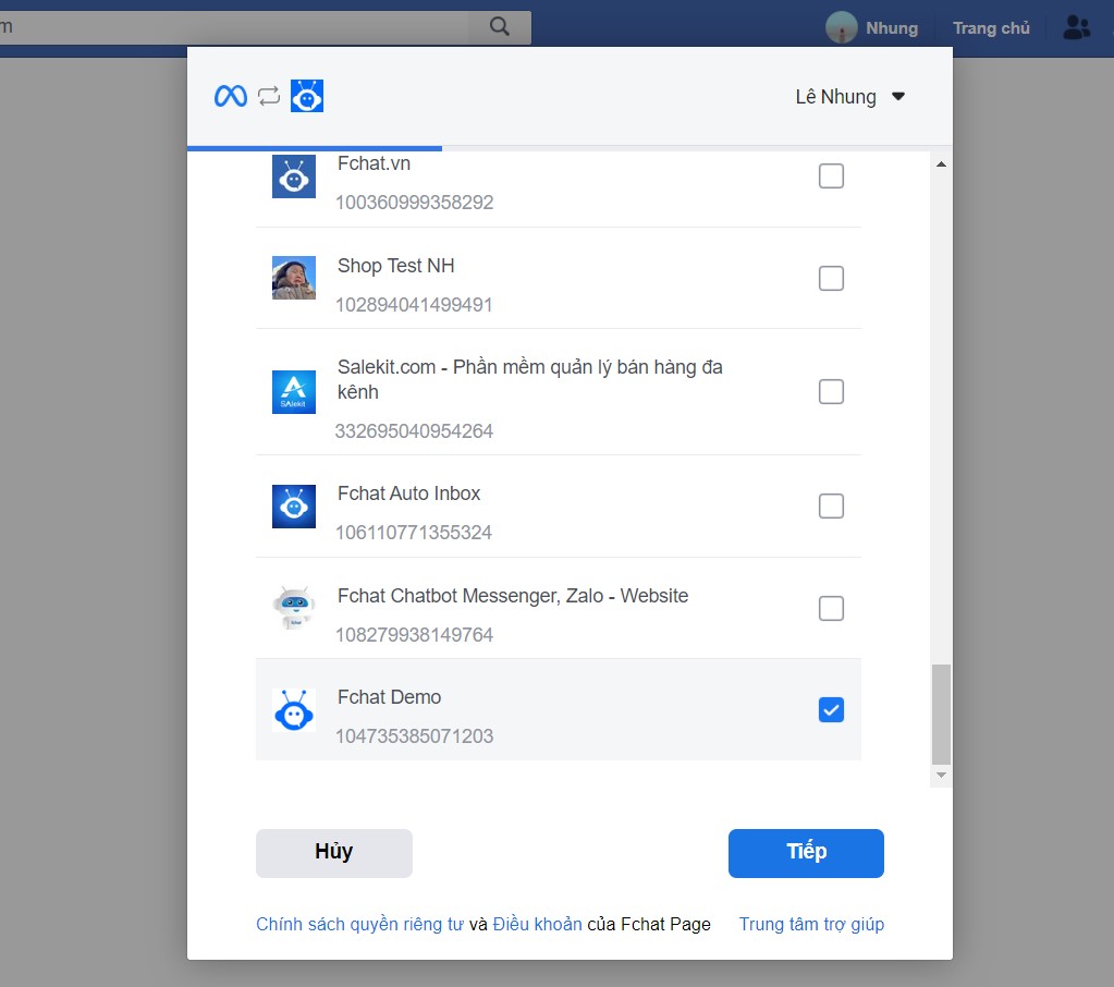 Khi đó, tất cả các Fanpage bạn có quyền Admin/Editor sẽ hiển thị trên màn hình. Bạn tick chọn các page muốn kết nối vào Fchat và ấn Tiếp để tiếp tục.