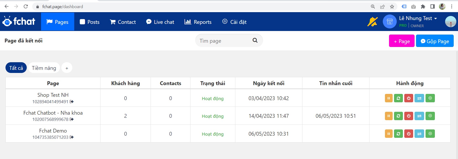 (7) Hành động: Các hành động đối với Fanpage (Dừng nhận và gửi tin nhắn từ/đến FB, Làm mới kết nối, Ngắt kết nối, Chuyển shop, Cài đặt page)