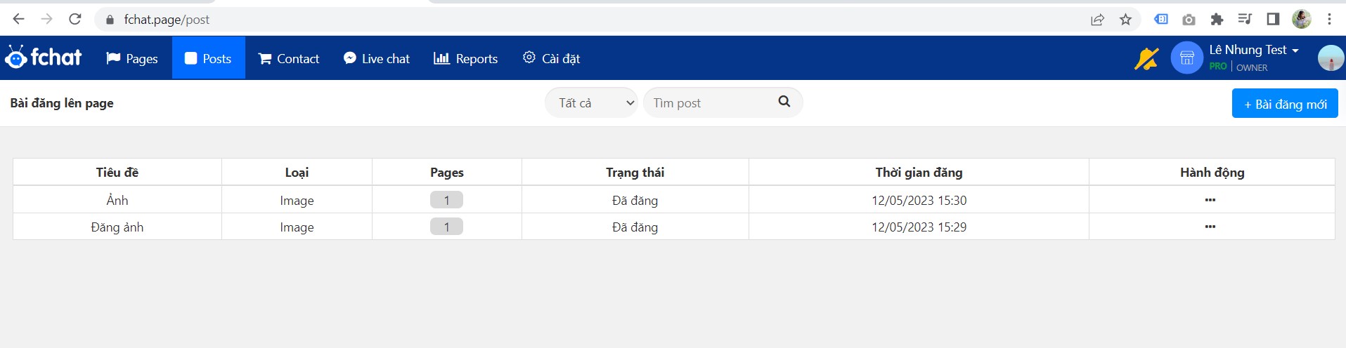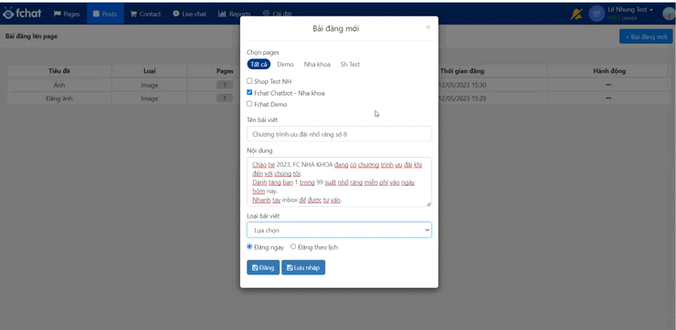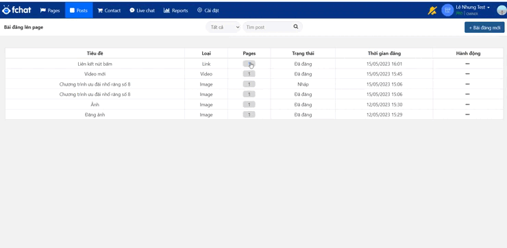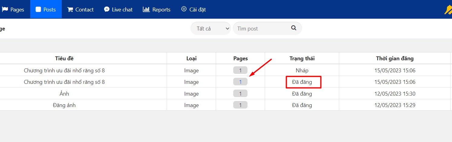 Bạn có thể lựa chọn thời gian đăng bài, hoặc đăng ngay. Sau khi được đăng thành công hệ thống sẽ ghi nhận Loại bài đăng - Số lượng page đăng bài - Trạng thái - Thời gian đăng bài.