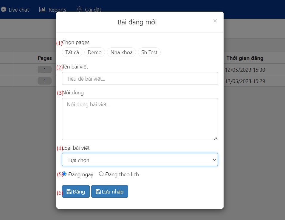 (6) Đăng - Lưu nháp: Bấm đăng hoặc lưu nháp để khi cần sẽ đăng lên page